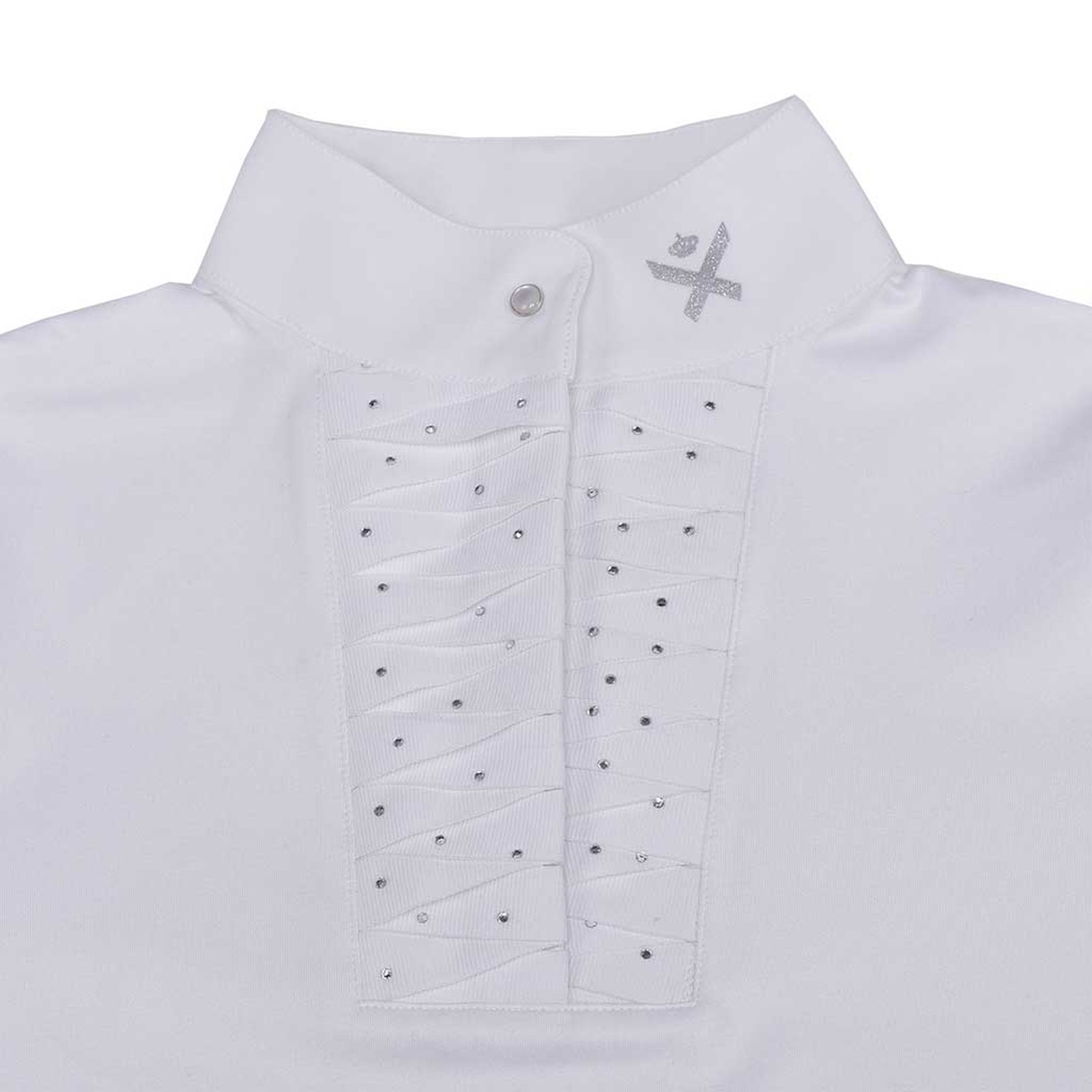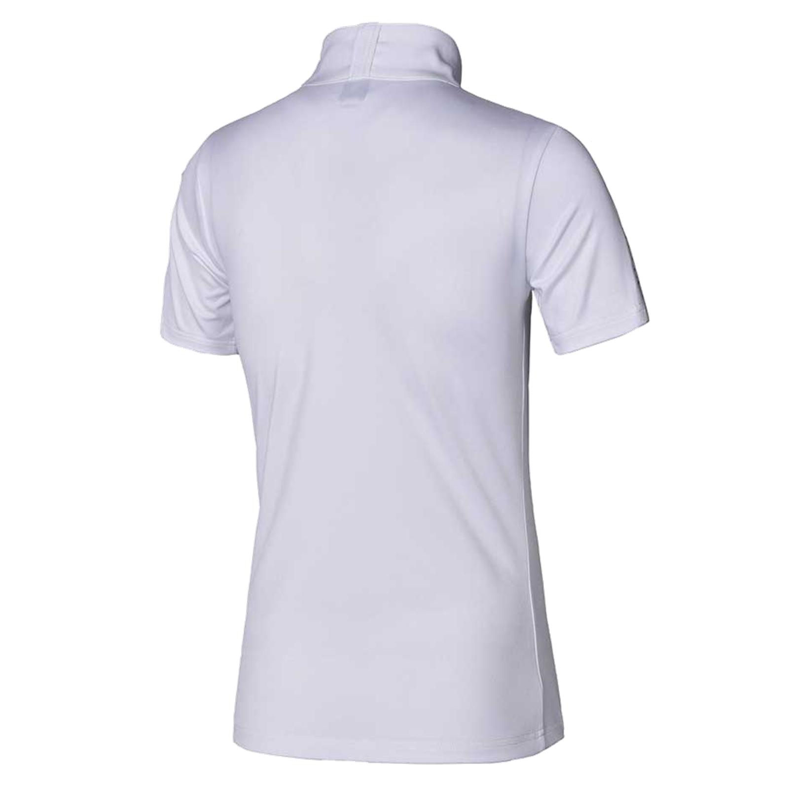 Logo print on collar and lower left front.Loop for stock tie on back collar.